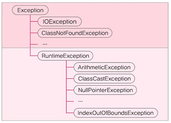 FileNotFoundException: 존재하지 않는 파일의 이름을 입력함 | NullPointerException: 값이 null인 참조변수의 멤버를 호출( String str = null; -> str.length xx) |