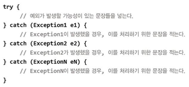 -> if문과 달리 try 블록이나 catch 블록 내에 포함된 문장이 하나여도 괄호{}를 생략할 수 없음