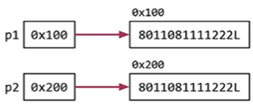 p1 == p2 -> 0x100 == 0x200 -> false (오버라이딩 하지 않으면 객체를 가르키는 주소로 비교)