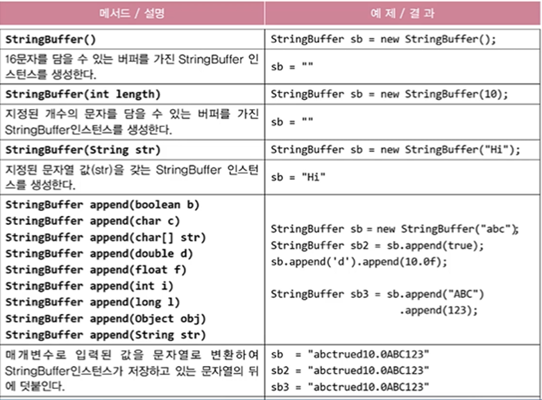 -> 오른쪽 코드처럼(.append.append)를 쓸 수 있는 이유가 반환타입이 StringBuffer이기 때문!(메서드 체이닝: 메서드를 계속 연결해서 호출할 수 있음)