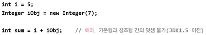 컴파일러가 자동으로 래퍼클래스의 객체인 Integer를 intValue( )메서드를 사용해서 기본형으로 바꾸고 기본형 i와 더해줌(언박싱)