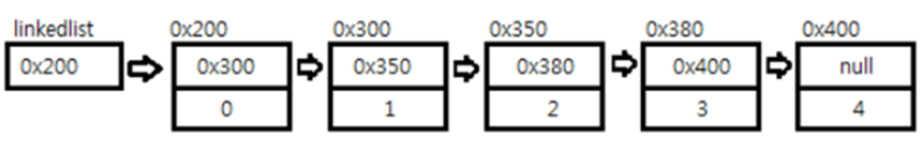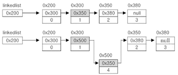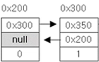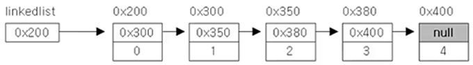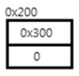 - 주소가 0x200인 노드가 다음 요소(노드)의 주소인 0x300(next)을 저장, 가리키고 있고, 데이터는 0(data)이다.