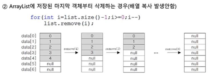 -> for문의 변수를 list 2.size( )-1부터 감소시키면서 거꾸로 반복시킨 이유: 만약 변수 i를 증가시켜가면서 삭제하면, 한 요소가 삭제될 때마다 빈 공간을 채우기 위해 나머지 요소들이 자리이동을 하기 때문에 올바른 결과를 얻을 수 없다. (자세한 건 뒤에)