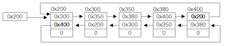 - doubly linked list의 첫 번째 요소와 마지막 요소를 서로 연결시킨 것(double linked list의 접근성을 보다 향상함)